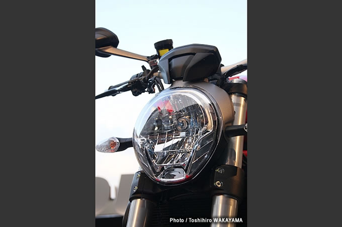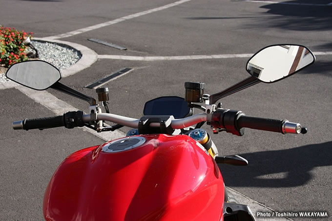 28ハンドルグリップ位置が 40mm 高く、40mm 手前に移動したことで、ライディングポジションはかなり一般的になった。が、超幅広のハンドルが低く前方にあるというモンスターらしさも適度に残される。