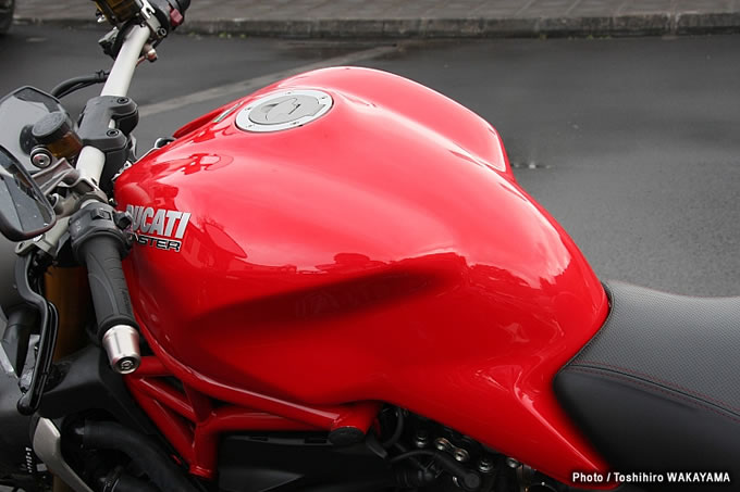 試乗したこのモンスター 1200 S は、跨ると従来のモンスター 1100 EVO よりも大柄になった印象があります。実際、車重も車格もひと回り大きくなっているのですが、走り出すとそのことをすっかり忘れ、従来型以上に扱いやすいことに気付かされます。足着き性が良く、低重心感のある車体には安心感があって、ライディングポジションも快適になっているからです。エンジンも穏やかで、ライダーの緊張を和らげてくれました。