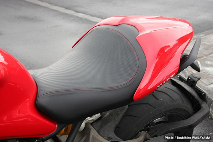 21クッション材は最厚部で 80mm の厚さを持たせ、快適性を重視。表皮には赤のステッチを施している。シートを外し、スペーサーを取り去りヒンジ位置を “低” 側にセットすることで、シート高は 810mm から 785mm に低くなる。