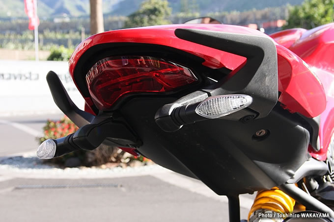 22テールライト、ブレーキライト、ウインカーともに LED で、リアフォルムをコンパクトにすることに貢献している。タンデムライダー用のグラブバーは、シートエンドのフォルムに溶け込んでいる。