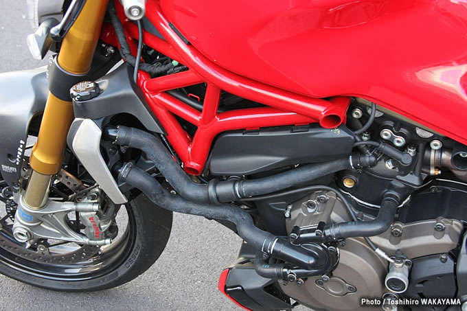 12ホイールベースはモンスター 1100 EVO よりも 11mm 長く、ひと回り大きい印象を受ける。だが、素直なハンドリングを得るため、前輪分布荷重を 50%から 47.5%に軽減するなどの造り込みを受けている。