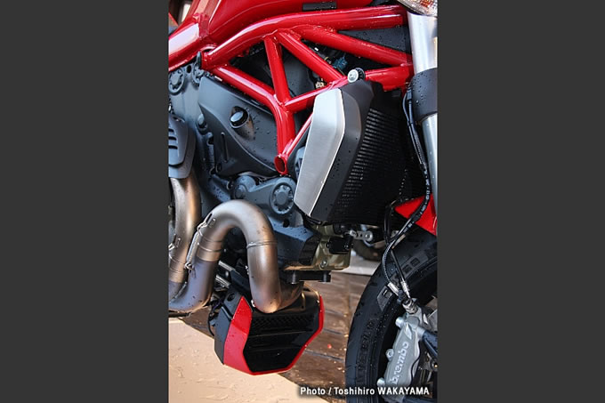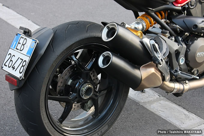 26マフラーは 2-1-2 方式で、右2本出しとなるのは、第2世代モンスターからの伝統でもある。ディアブロ・ロッソIIのリアタイヤは、サイズが 190/55ZR17 で、モンスター 1100 EVO よりも太い。