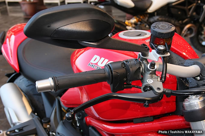 29フロントブレーキのマスターシリンダーは、ブレンボのラジアルマウント式で、やや小径化することにより効力を高めている。異形5角形のミラー部とアルミ鋳造のステー部からなるバックミラーは、ディアベルと形状が同じだ。