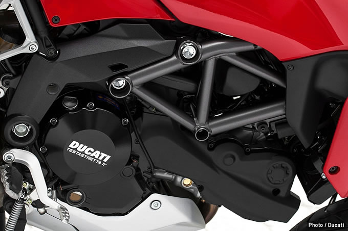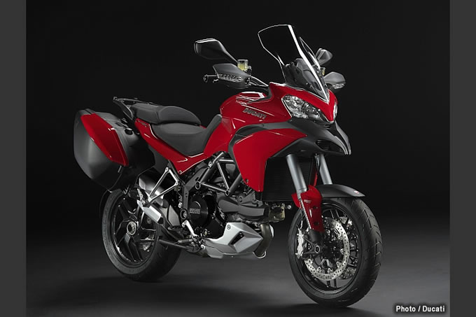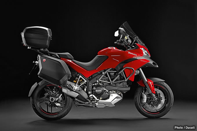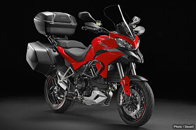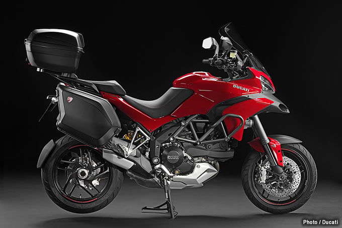 2013年モデルで大きく刷新を受けたムルティストラーダシリーズ。モデルラインナップ、デュアルスパークのテスタストレッタ 11°エンジン、ムルティストラーダ 1200 S ツーリング/グランツーリズモ/パイクスピークに採用されたセミアクティブのスカイフックサスペンションなど、基本的な部分は 2014年もそれを継続します。変更点はカラーリングで、ツーリング・グレイの1色だったムルティストラーダ 1200 S グランツーリズモにレッドが追加され、逆にスタンダードのムルティストラーダ 1200 からはマットクロムがなくなりレッド1色に。オフィシャルフォトでご紹介するドゥカティ 2014年モデルの第一弾、ムルティストラーダシリーズをご覧ください。