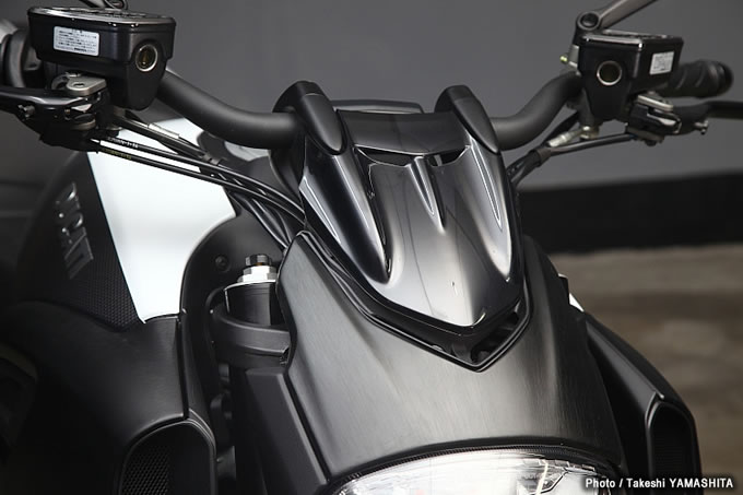 02新デザインとなったアッパーインストルメントパネルカバーと新型ハンドルバーライザー。複雑な形状をしたパネルカバーは、デザインの美しさのみならず、エアディフレクターとしての整流効果も高く、ライダーに当たる走行風を整えてくれる。