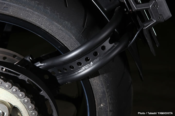 07リアコンビネーションランプとは独立したナンバープレート取付方法が特徴的なディアベル。240 サイズのリアタイヤを迂回するナンバーサポートはデサイン変更を受けた。スイングアームのリアハブマウントから立ち上がり、ナンバー灯のハーネスも巧みに隠される。