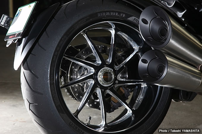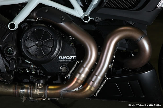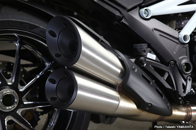 10ステンレススチールのサイレンサーもニューディアベルの大きな識別点のひとつ。太く短く、そして斜めにカットされた形状がさらなる迫力を与えている。ディアベルカーボンではつや消しステンレスの素地をそのまま使用し、ディアベルではブラック仕上げとなる。