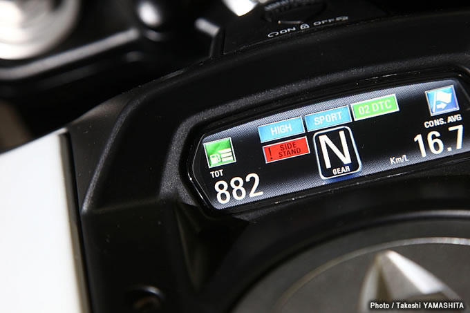14燃料タンク上の TFT カラーディスプレイには、新たに燃料計とサイドスタンド警告灯が追加された。この燃料計は5本のバーで残量を表示し、バーが1本になると燃料計のアイコンがイエローに変化し、1.1 リットル以下になると点滅するという精巧なもの。