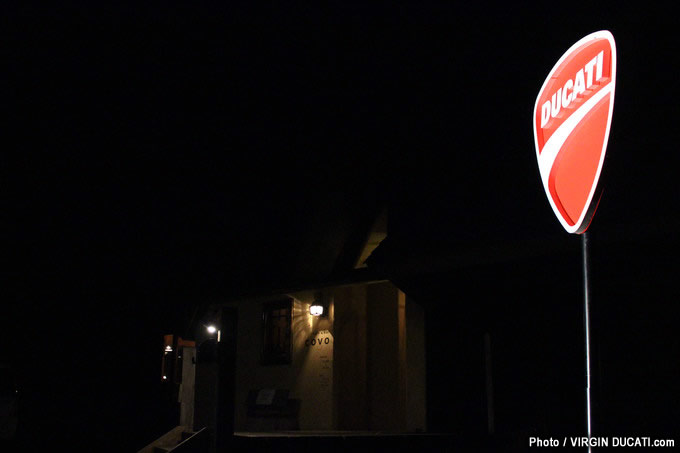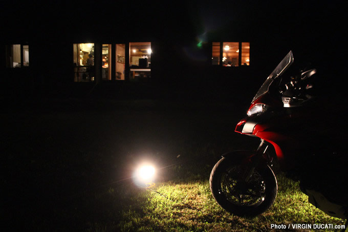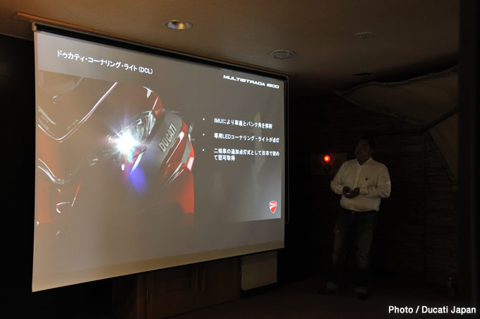 03かなり充実した内容の車両説明と質疑応答は軽く2時間を超え、夕方には別の場所に用意された試乗会場まで自走で移動。モード切替による車体の動き、それに新搭載のDCL(ドゥカティ・コーナリング・ライト)を確認するため、暗くなるまでパイロンの周りをぐるぐる。