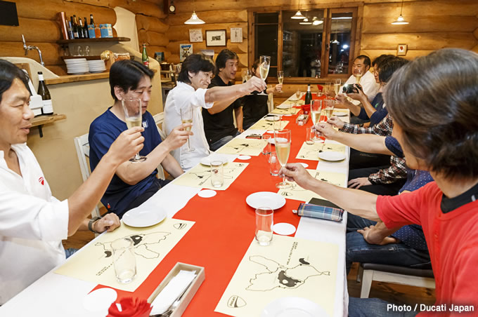 05ドゥカティジャパンより代表と社員の方々、オフィシャルカメラマン、それにメディアのみなさんと懇親を深めます。イタリアのプレミアムブランドであるドゥカティを表現するため、こうした「場」の設定には相当こだわりを持っているのがわかります。