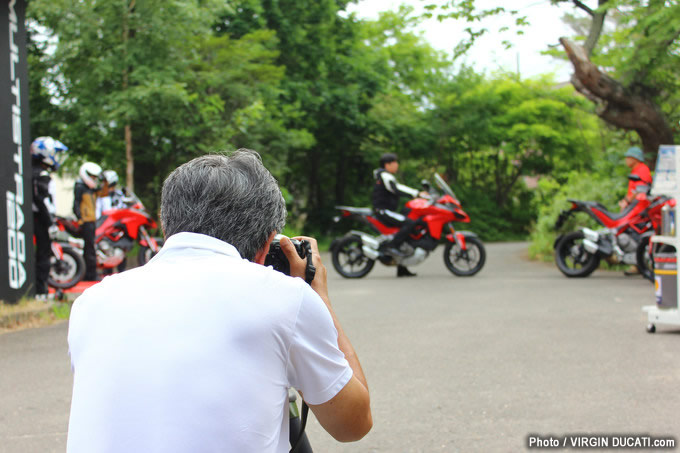 09スタート前にオフィシャルカメラマンによる足つき性の確認カット撮影。新型ムルティ(日本仕様)はシート高が800-820mmに調整可能な可変式のため、各メディアで何カットも撮影します。