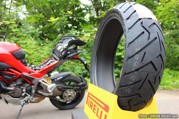 10新型ムルティに装着されるタイヤは『ピレリ スコーピオン トレイル II』です。サイズはフロント120/70ZR17、リア190/55ZR17で、そのパターンを見てもオンロードスポーツタイヤとほとんど相違ありません。「これでグラベルを走るのか…」と怖気づくのは当然のことでしょう。