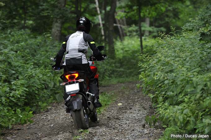 17DSS Evo(ドゥカティ・スカイフック・サスペンション・エボリューション)は不整地での適正な衝撃吸収とトラクションを制御してくれるので、235kgの巨艦でも前後17インチのピレリが開発したエンデューロ・ストリート・タイヤがしっかり受け止めてくれます。また、ホイールトラベルは変えずに最低地上高を20mm上げているところもポイント。