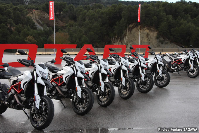 02ずらりと並んだピカピカのハイパーモタード939(スタンダードモデル)。ドゥカティのプレス試乗会ではお馴染みの光景だ。このスタンダード仕様は公道でのテストが行われた。