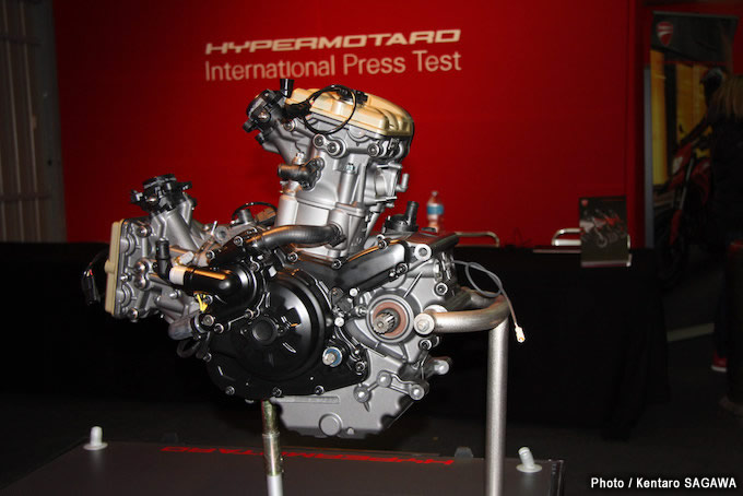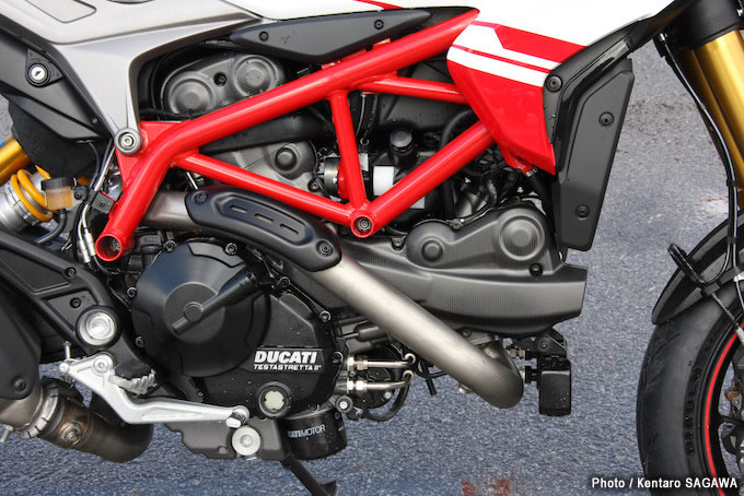 新型と従来型ハイパーモタードとの大きな違いはエンジンです。水冷のL型2気筒エンジンは、基本的には従来を継承したテスタストレッタ11°ですが、ボアを拡大して排気量を821ccから937ccに拡大。ピークパワーでも3ps強のアップを果たしていますが、注目すべきは常用域で最大18%もトルクアップしていることでしょう。車体に関しては、ほぼこれまでどおりで、特別に変更箇所のアナウンスはありませんでした。とはいえ、ECUの設定をはじめ、排気系も新設計となるなど、細かい部分にはいろいろと見直しがなされています。
