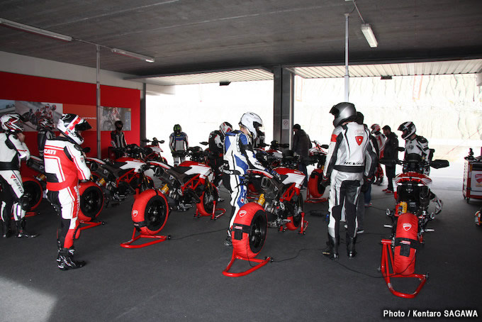 05世界中から腕自慢のジャーナリストが集う国際試乗会。グループごとにドゥカティの専属メカニックが付いてサポートしてくれる。この日も急きょレインタイヤに履き替え、走行直前までウォーマーで加熱するなど、レース並みの対応をしてくれた。