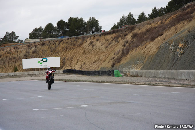 2016年にデビューするハイパーモタード939シリーズのプレス向け国際試乗会に参加してきました。会場となったのは、スペインのバルセロナ近郊にあるカステローリ・サーキット。のどかな自然に囲まれた本格的レーシングコースです。まずは今回のシリーズの中でも上級モデルに位置づけられる『ハイパーモタード939SP』のトラックテストが行われました。