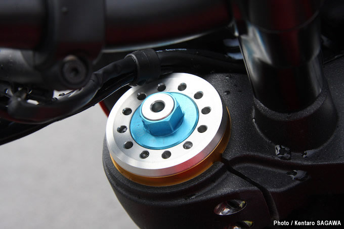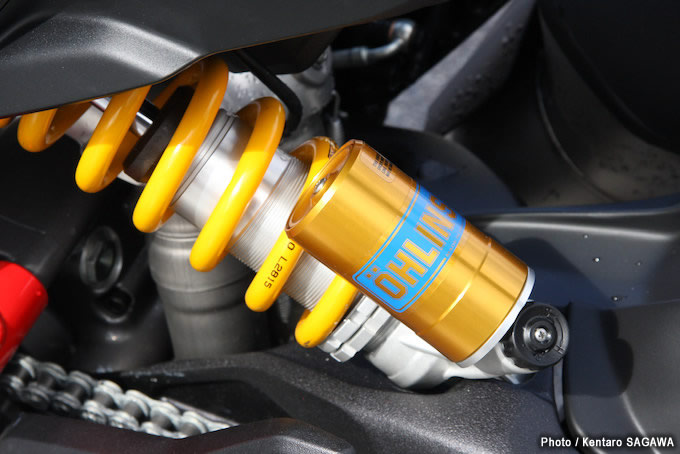 12フロントには50mm径のオーリンズ製フルアジャスタブル倒立フォークを装備する。