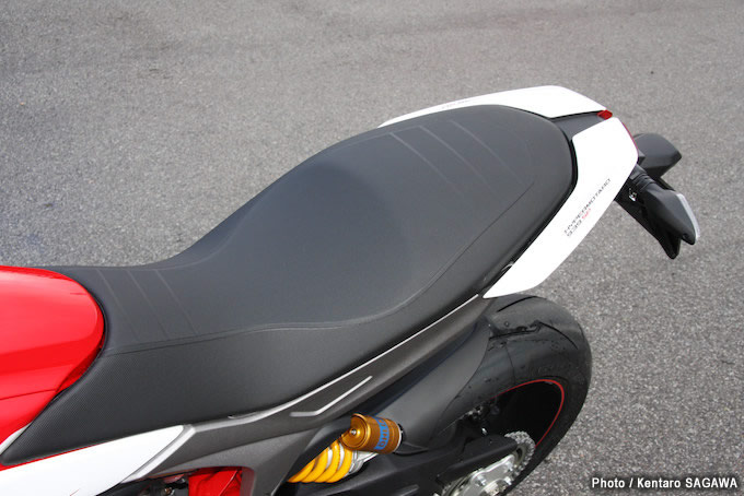 14ハイパーモタード939SP専用のスポーツシートを装備。レザーには滑りにくい加工が施され、ホールド感は良好だ。オプションで20mm低いローシート設定もある。