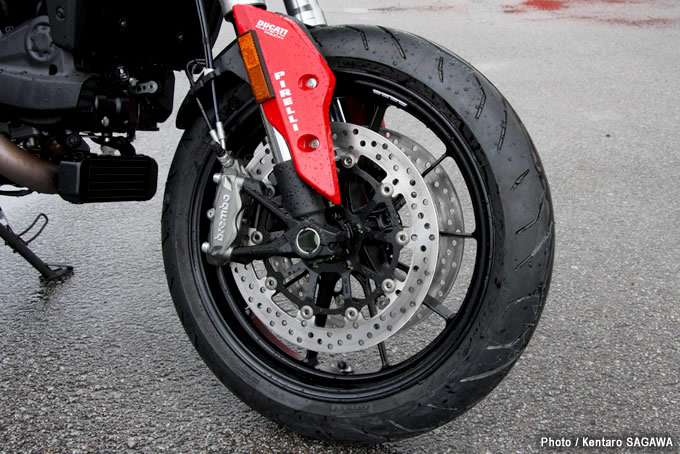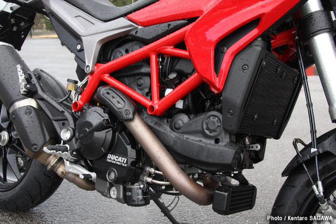 とはいえ、トラクション・コントロールとABSの組み合わせは、路面コンディションが悪いときほど心強いものです。本当はドライで存分に走りを楽しみたかったのですが、逆に言えば雨の中だったからこそ、新型ハイパーモタードの素性の良さを知る機会になりました。カタチは一風変わっていますが、普通にツーリングできるスタイリッシュなドゥカティですね。