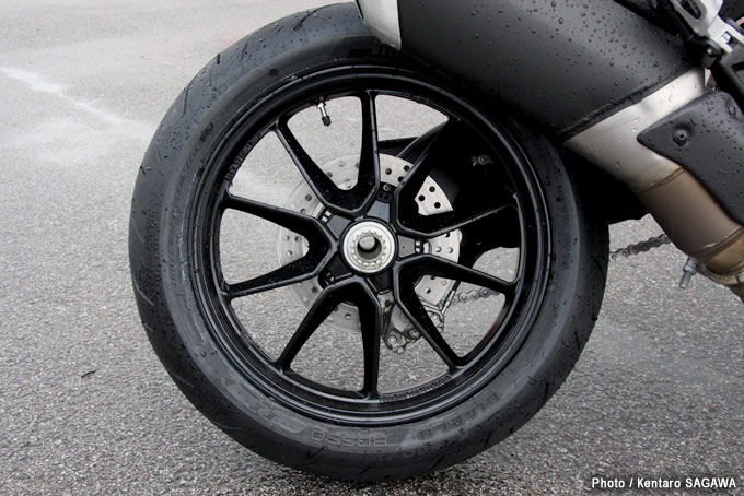 エンジンは従来型よりパルス感が増して、よりスムーズになった印象。中回転域のトルクが約2割増したことでギンギンに回さなくても十分速い。タイトコーナーでは忙しくシフトダウンせずとも、感覚的にはひとつ上のギアで立ち上がってそのまま引っ張れる感じ。アクセルのツキも穏やかで、わざとガバ開けしてみたりもしましたが、濡れた路面にもかかわらず意外なほどスピニングしません。ライディングモードもそれぞれ切り替えてみたのですが、基本的に素直さは変わらず、鉄板を通過したとき以外はほとんどトラコンのお世話になることはありませんでした。スムーズな出力特性に加え、きっと純正装着されているピレリタイヤの恩恵も少なくないでしょう。