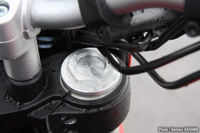最大の違いはサスペンション。前後オーリンズが与えられたSPに対し、スタンダードはフロントがカヤバ製、リアがザックス製で調整機構も制限されています。前後のホイールトラベルもSPが185mm/170mmであるのに対し、スタンダードは170mm/150mmとやや短め。結果的にシート高は逆に870mmとSPに対して20mm低くなっています。またタイヤも公道走行に適したピレリ製ディアブロ・ロッソIIがOEM装着されています。