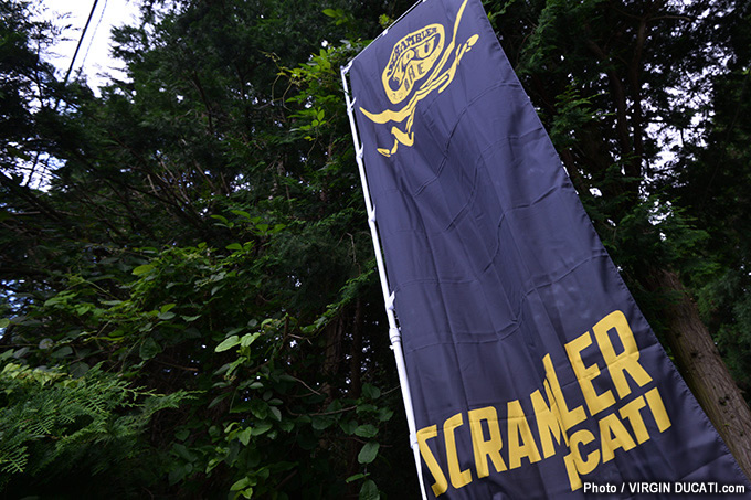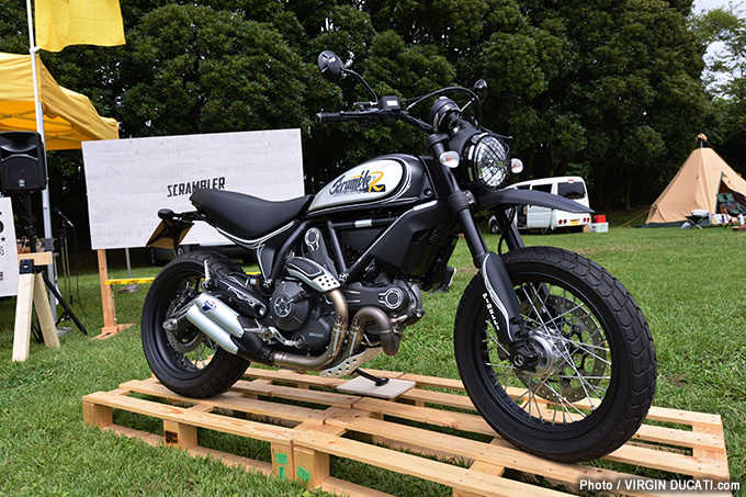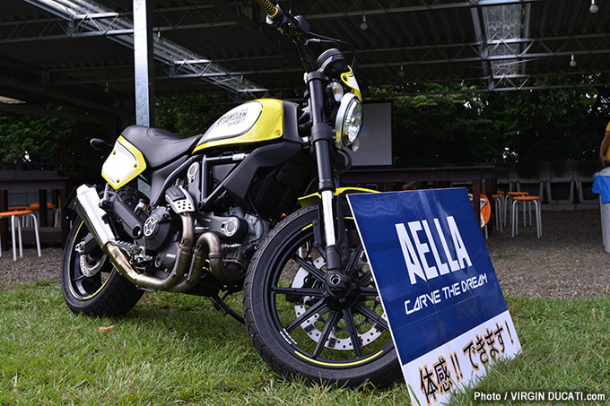 16AELLAのマフラーが取り付けられたスクランブラーの試乗車も用意され、参加者の注目を集めていた。