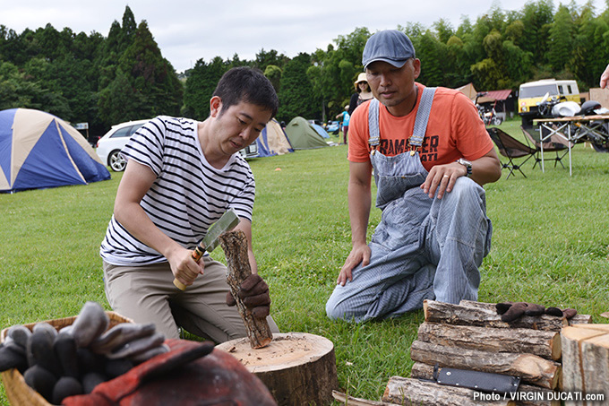 13キャンプイベントならではのコンテンツ、薪割り体験。初めての鉈に参加者も悪戦苦闘の様子であったが、スタッフが丁寧にレクチャーしてくれるから安心。