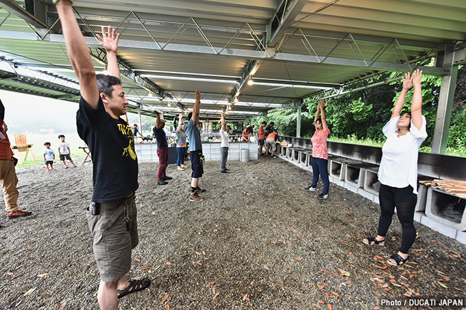 話題のニューモデルSixty2を使った「遅乗りドラッグレース」や「くねくね試乗」、キャンプイベントならではの「薪割り体験」、さらに疲れた身体を癒してくれる「指圧キャンプ」、もちろん夜にはお待ちかねの「BBQパーティー」が開催され、大満足の内容であった。テント泊の参加者には、翌朝ビュッフェスタイルの朝食が振る舞われ、清々しい朝を体感する「朝ヨガ」も実施。雨模様の天候であったが、そんなことはお構いなしに参加者はそれぞれの時間を楽しみ、イベントを満喫しているようだった。
