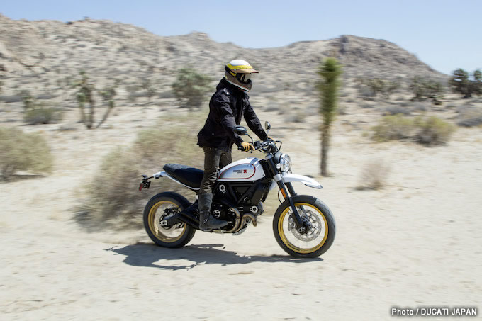 2017年モデルに追加される次のモデルは、ドゥカティスクランブラー・デザート・スレッドだ。1970年代から80年代のアメリカン・オフロード・バイクを想起させるこのニューモデルによって、スクランブラー・ラインナップがさらに拡充。フレームとサスペンションを改造し、ホイール(フロントは19インチ)をスポークタイプにするとともにスタイリングも大きく変更したことで、スクランブラー・デザート・スレッドは、時には舗装路を離れ、「ランド・オブ・ジョイ」のスピリットを全開にしてオフロード・ライディングも楽しみたいライダーの要求を完璧に満たしてくれる。ドゥカティスクランブラー・デザート・スレッドの優れたオフロード走破性能は、型式認証済みの新しいヘッドライト・メッシュガード、取り外し可能なラバー・パッドを備えたオフロード・スタイルのフットペグ、ハイ・マッドガード(このモデル用に特別にデザイン)、そして、このモデルにとっては当然の装備であるエンジン・スキッドプレートによって明確に示されている。
