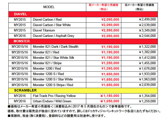 ドゥカティジャパン株式会社は、5月24日より下記対象モデルのプライスを改訂することを発表。更に、対象車種を5月24日~6月30日までに、成約・登録されたユーザーにEver Red(新車延長保証)を1年間提供するキャンペーン「Ducati Ever Red Campaign」を実施することとなった。
