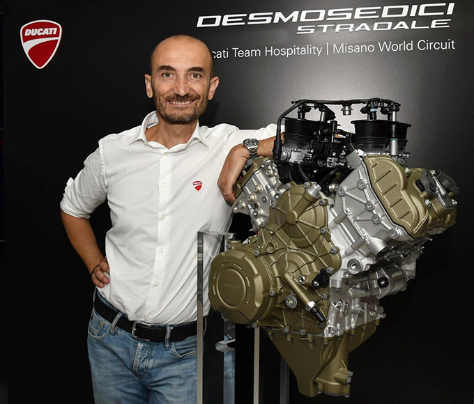 2017年9月7日、ミザノ・ワールドサーキット・マルコ・シモンチェリで発表された新しいV4エンジン「デスモセディチ・ストラダーレ」。MotoGP で圧倒的なパフォーマンスを誇る4 気筒デスモセディチGP の経験をもとに、未来のハイパフォーマンス・モデルに搭載する、新しい90°V4 エンジンが開発された。このエンジンは、ドゥカティが量産バイクに搭載する初の4 気筒エンジンとなる。