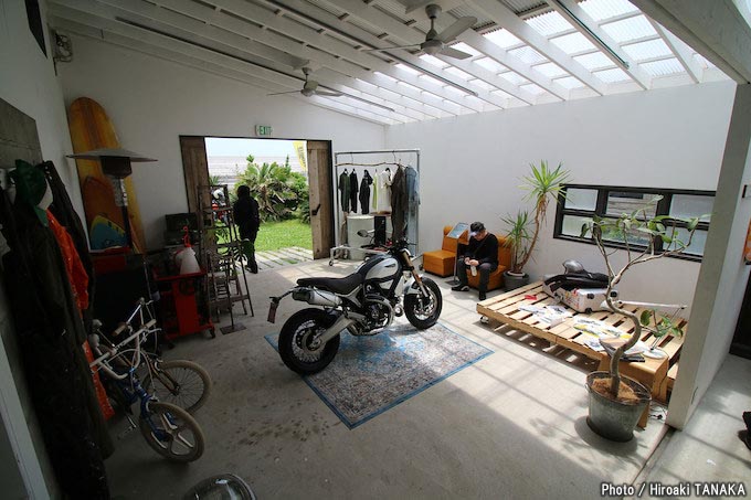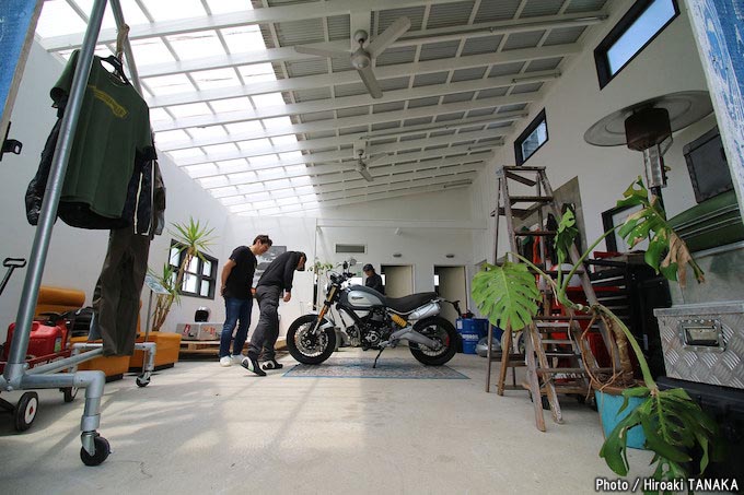 スクランブラーのカラーで彩られたガレージハウス。これまでのイベントとはちょっと違った空間に魅了される。
