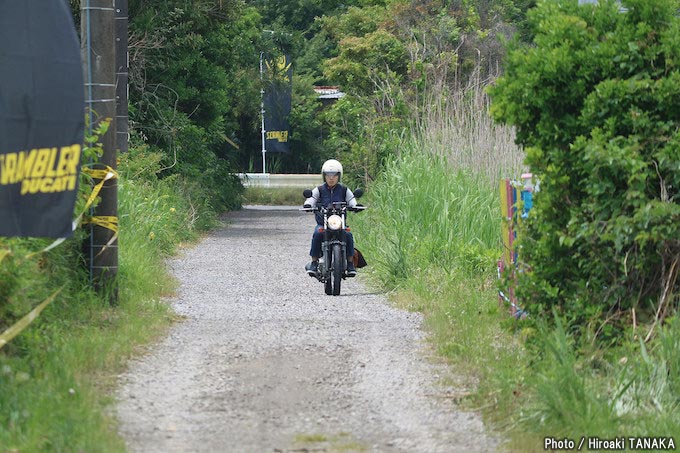 会場の入り口まで続く一本のフラットダート。スクランブラーだからこそ楽しめるロードと言えよう。
