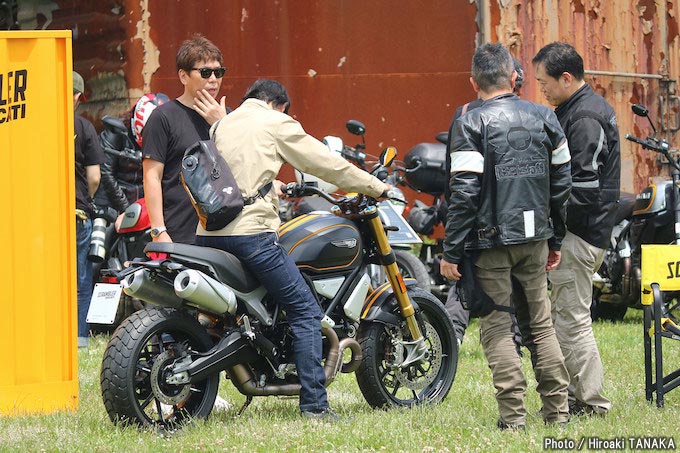 やはりスクランブラー1100への関心度は高い。実際に跨がり、そしてエンジンをかけてそのエクステリアも体感。スタッフにもさまざまな質問が飛んでいた。