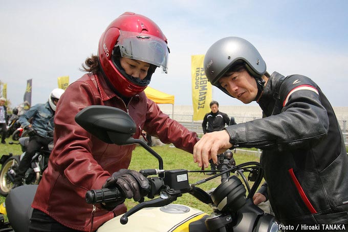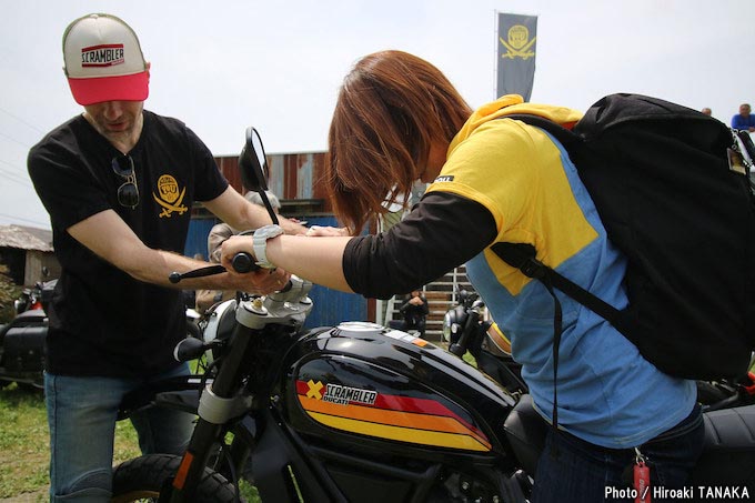 車高が高いスクランブラー デザートスレッドにまたがってみる女性ライダーを自ら支える気さくなシーンも。このLAND OF JOYではマッツファンも増えた?