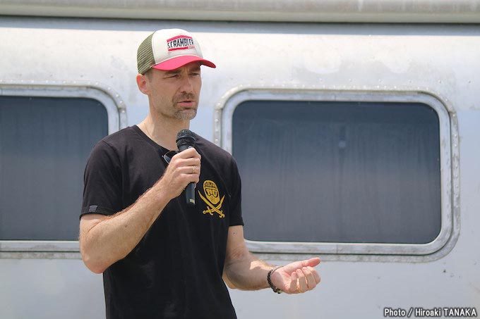 「今日はスクランブラー1100に触れて、跨がって、エンジンをかけて、いっぱい楽しんでほしい」と語るリンドストレーム社長。快晴に恵まれたことにご満悦だった様子。