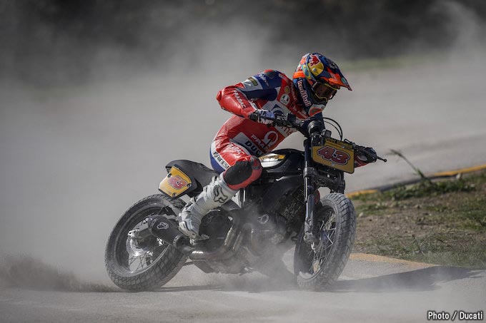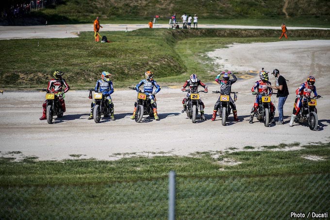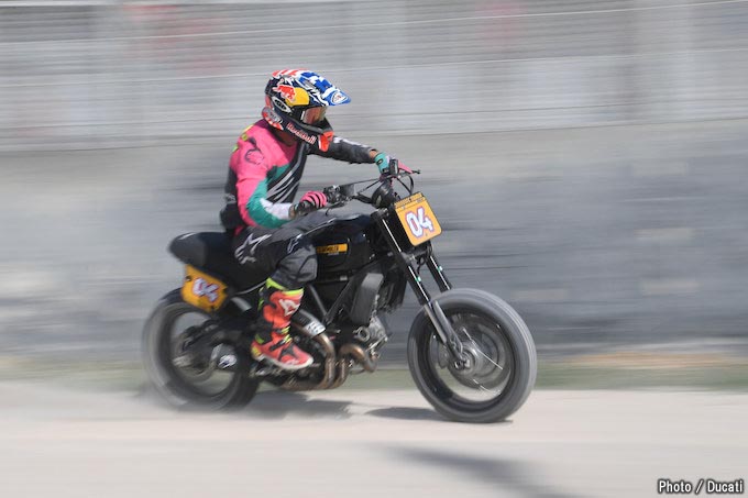 ミザノ・ワールドサーキット・マルコ・シモンチェッリで開催された「フラットトラック・レース」。日本ではダートトラック・レースと呼ばれることが多い。ここでは800ccの「スクランブラー・フルスロットル」を特別にカスタムされた車両に、MotoGPやSBKなどを戦うドゥカティのワークスライダーが跨がり、本気のレースをみせた。勝利したのは#04のアンドレア・ドヴィツィオーゾ。