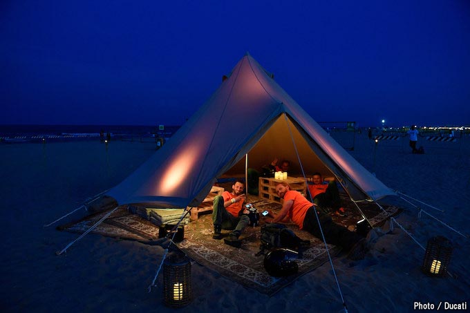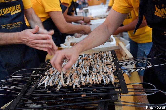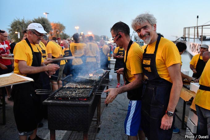 パレードは、遊園地のほかレストランが建ち並ぶマリーナ/ロモ・リミニが目的地。そしてそこでは「スクランブラー・ビーチパーティ」と題されたBBQパーティを開催。ドゥカティ首脳陣たちが来場者をもてなした。
