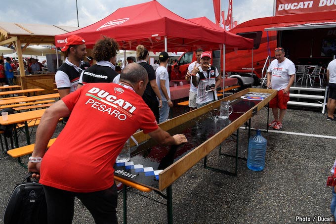 「インターナショナルビレッジ」では各国のドゥカティスタッフがさまざまな出し物で来場者をもてなした。写真はドイツ・ブース。テーブルの上を、水入りビアジョッキを滑らせ、的の中央に止めるというもの。意外と難しい。
