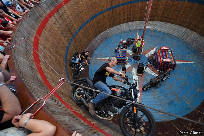 木製の板で組まれた円柱状の壁をバイクで走る「ウォール・オブ・デス」。普段は軽量な旧車を使ってアクションを行うが、今回はスクランブラーを使って(しかも2台同時!)壁を走った。