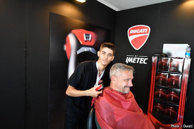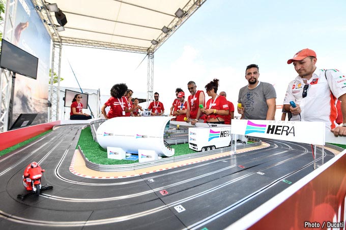 人もあふれかえっていた。ドゥカティのモデルファミリー毎に展示エリアが分かれ、各モデルの世界観を活かした車両&趣向を凝らした展示を行っていた。ピットエリアにはMotoGPやSBKのワークスチームがマシンを展示。運が良ければワークスライダーを間近に見られることから、常に人だかりができていた。
