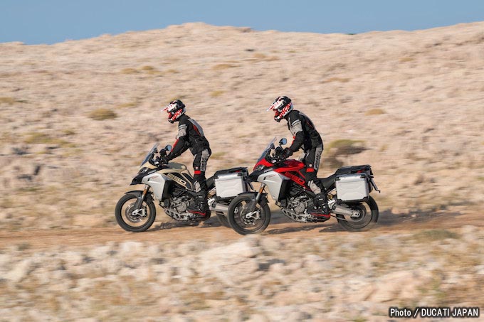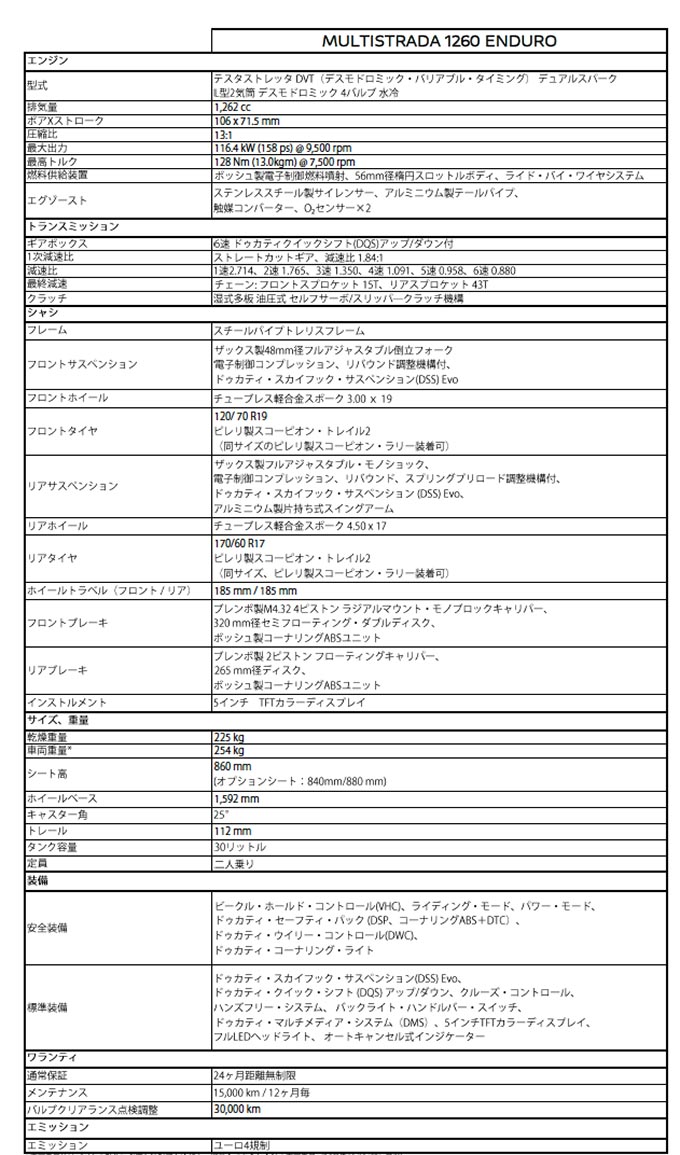 一方、ライド・バイ・ワイヤーによるライディング・モードにスムースなシフト操作を実現するドゥカティ・クイック・シフト(DQS)アップ/ダウンを装備。前後17インチのムルティストラーダ1260に対し、ムルティストラーダ1260エンデューロはフロント19インチ、リア17インチのスポークホイールを装着し、フロント/リアともにホイールトラベル185mmのザックス製エレクトロニクス・セミアクティブ・サスペンションが採用されている。容量30Lのフューエルタンクにより、航続距離は450kmとなっている。シート、ハンドル、重心は1200モデルより低い位置に設定され、幅広いライダーに快適な旅を約束してくれる。