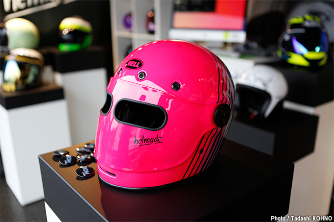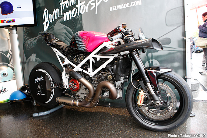 オンラインのヘルメット用カスタムペイントサービスを展開するHelmade(ヘルメイド)。会場ではブースを出展し、そのオンラインサービスをプレゼンテーション。またヘルメットカスタムの一環として、人気のBELL製ビレットモデルのバイザーをカスタムした、カーレースに使用された目だしタイプのBELL STARを彷彿とさせるカスタムヘルメットを発表。そのカラーリングとヘルメットのテイストに合わせ、999Sをストリートファイター風にカスタムした車両を発表。レースにも参戦した。