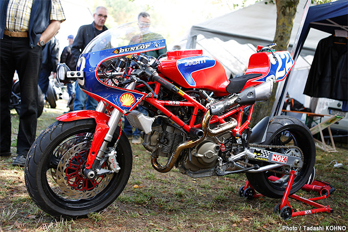 カスタムバイクによる欧州スプリント選手権「Sultans of Sprint/ソルタンス・オブ・スプリント」に参戦しているマシン。この車両はオリジナルのトレリスフレームとハブステアを採用。エンジンはムルティストラーダ1000DS用の空冷デスモを採用している。マシンを製作したのはベルギー在住のバーナード・モント。長く自動車の選手権レースに携わり、そこで得たノウハウをマシン造りに活かしている。フレームとエンジンとホイールだけというスタイルながら、圧倒的な存在感を見せる。