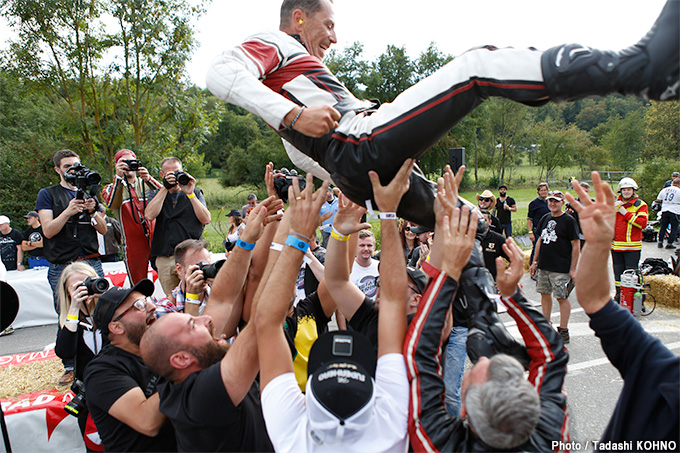 「Sultans of Sprint/ソルタンス・オブ・スプリント」のフリークスクラスで優勝を果たしたのは、イタリアのカスタムファクトリー/サウス・ガレージ。モンスターS2Rのフレーム&エンジンを使用しながら外装類を一新。アルミ製のガーダーフォークにオリジナルのスイングアーム&オーリンズ製サスペンションで武装する。優勝が決まった後、ライダーを胴上げ。