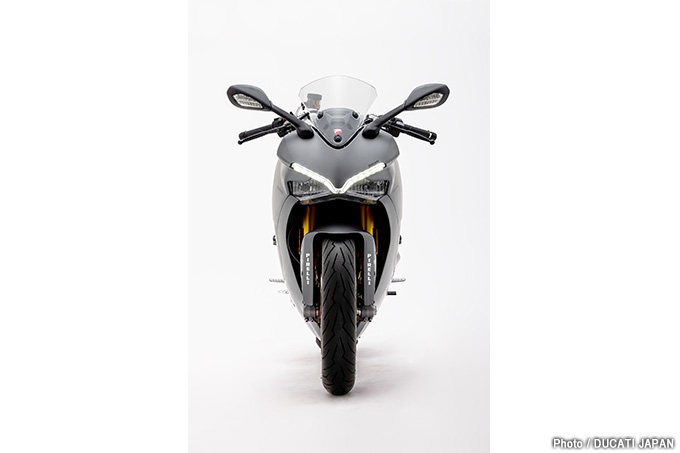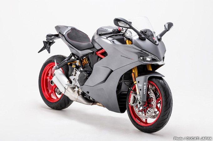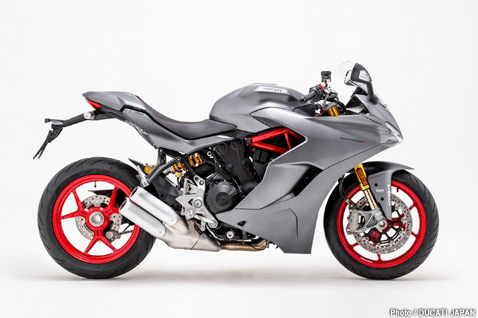前後にオーリンズサスペンションを装備したスーパースポーツの上位モデル、スーパースポーツSにはレッドとスターホワイト・シルクの2色が用意されていたが、2019年モデルで日本限定カラーのマット・チタニウム・グレイを追加。ソリッドなマット仕上げのチタニウム・グレイというカラーと赤のフレーム&ホイールのコントラストがなんとも美しいモデルに仕上げられている。