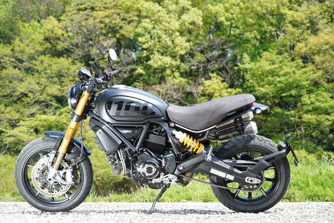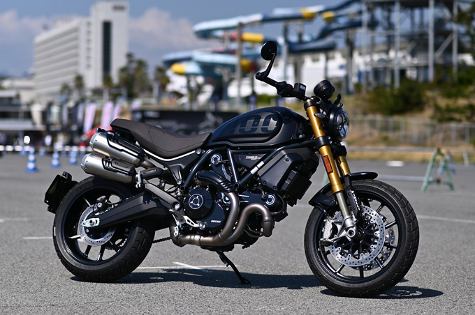 スクランブラー1100スポーツプロの試乗を行った。スタンダードシリーズが803ccエンジンを採用しているのに対し、こちらは排気量1079ccの空冷Lツインエンジンを搭載。低回転から多大なトルクを発生し、スロットルをワイドオープンすればいとも簡単にフロントタイヤの接地感はなくなる。私は以前モンスター1100Sに乗っていたことがあるのだが、その頃と比べアクセルレスポンスが格段に向上し扱いやすくなっているのも魅力に感じる。フロント18インチ、リア17インチのタイヤサイズはオンオフ問わずそつなくこなすベターバランスであり、未舗装路にも足を踏み入れたところ、大きな体躯でありながらもコントロールしやすかった。前後オーリンズでまとめられた足まわりもライディングをより楽しいものとしてくれるポイントだ。