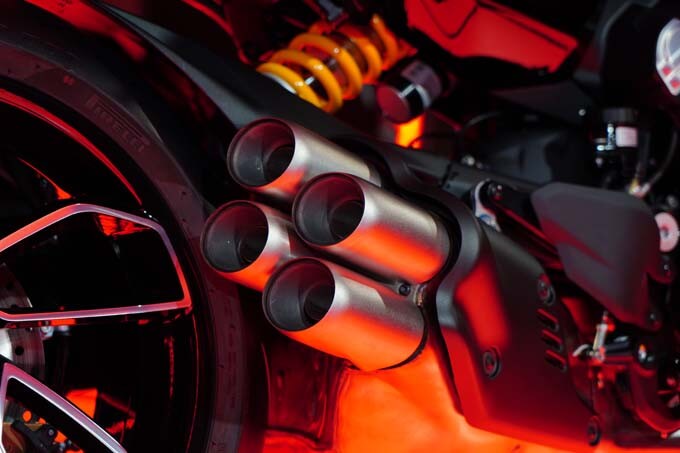 まるでガトリング砲のようなデザインとされたショートタイプのサイレンサー。走行中リアバンクシリンダーを休止させるシステムも採用されており、それに伴いエキゾーストサウンドの変化も楽しめる。