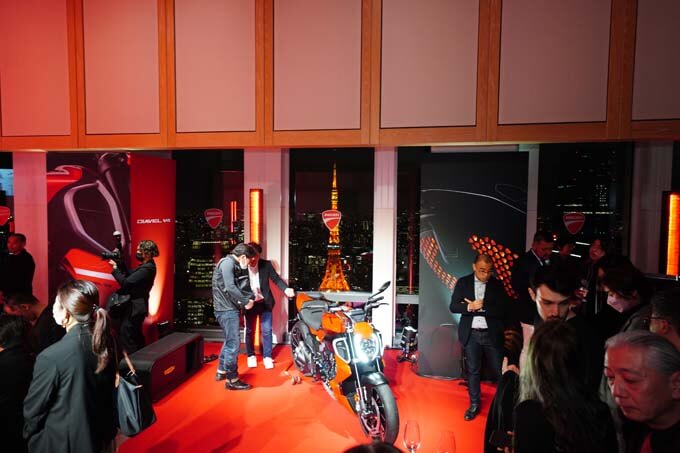 会場となったアンダーズ東京は虎ノ門ヒルズの最上階に位置し、眼下には東京タワーをはじめ世界都市TOKYOの景色が広がる。そこにVIP、ドゥカティ正規ディーラースタッフ、インフルエンサー、そして我々メディア関係者が集い、新型ディアベルV4のアンベールを待った。